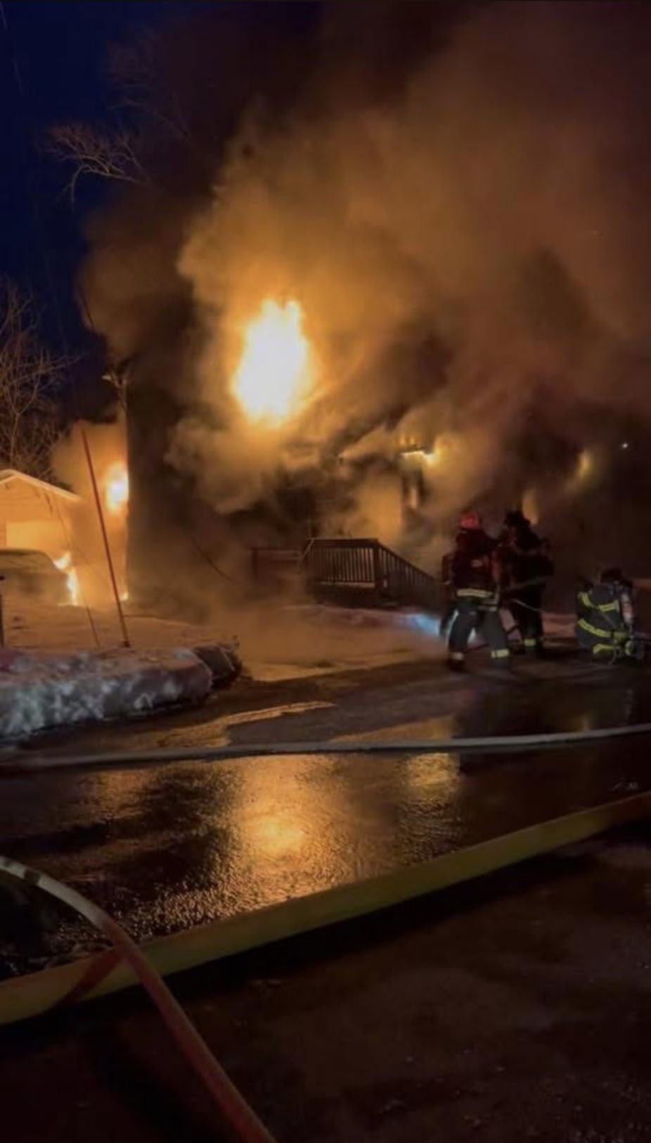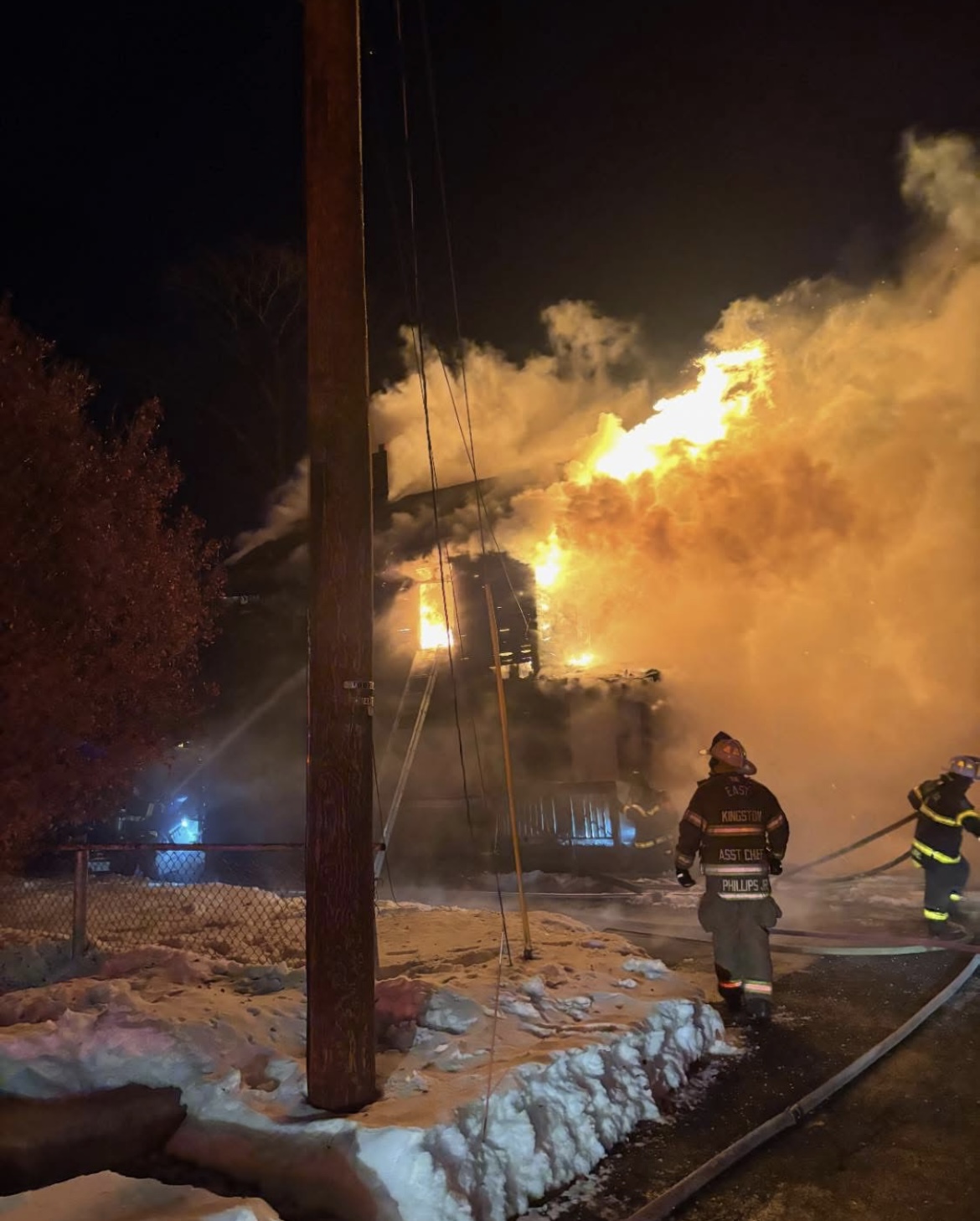 On Saturday, February 7th, at approximately 1807 hours, Ulster Hose was dispatched under mutual aid to the East Kingston Fire Department for a 2nd alarm structure fire. Cars 1 and 4 and Engine 4 arrived to find 2 floors of a single family dwelling well involved. Crews assisted in fire suppression and searches while battling frigid temperatures and a wind driven fire. Members operated for approximately 2 hours before returning to service.